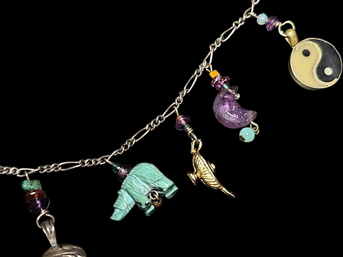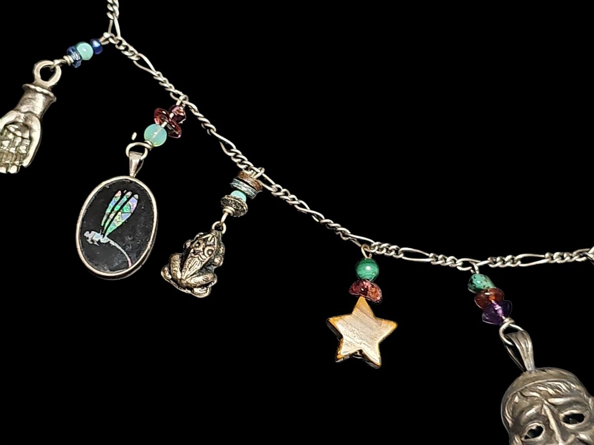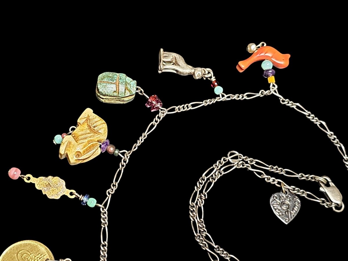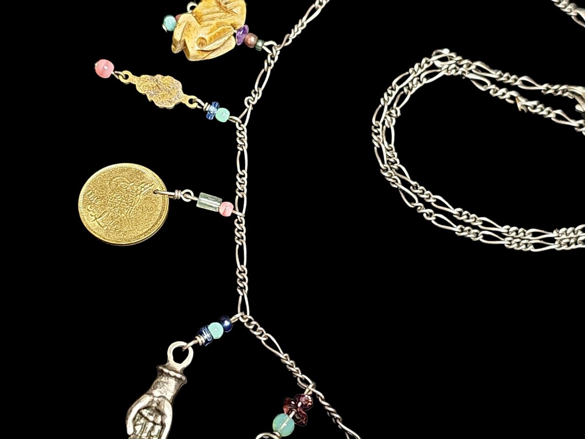 The necklace displays excellent vintage character with light, even wear consistent with age. All charms are securely attached, the chain is intact, and the clasp functions as it should. The overall presentation is strong, expressive, and highly wearable, whether styled as a statement piece or layered with other vintage jewelry.