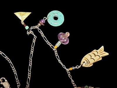 Anchoring the design are comedy and tragedy motifs, referencing classical theatre symbolism, surrounded by a lively mix of figural, celestial, abstract, and symbolic charms. The variety of shapes, textures, and colors creates visual movement along the chain, inviting closer inspection and giving the piece a true one-of-a-kind presence when worn. This is not a uniform charm necklace ? it is intentionally curated, eccentric, and artistic, very much in line with Lucy Isaac?s New York studio aesthetic.