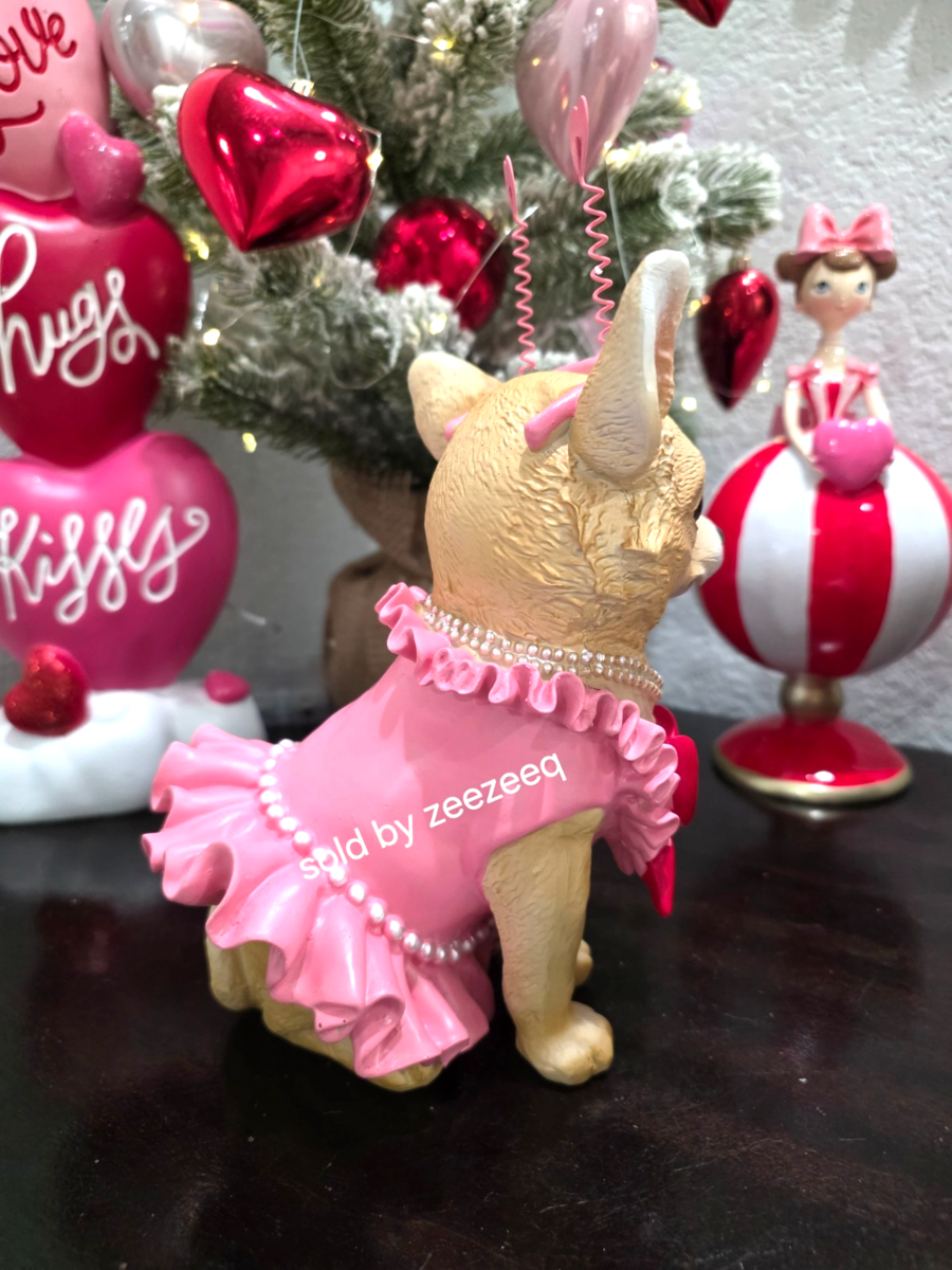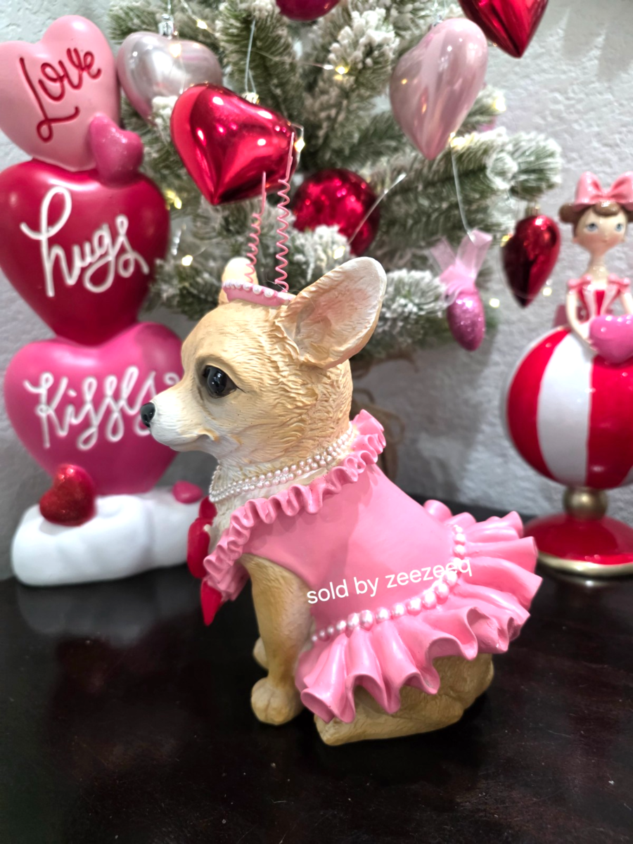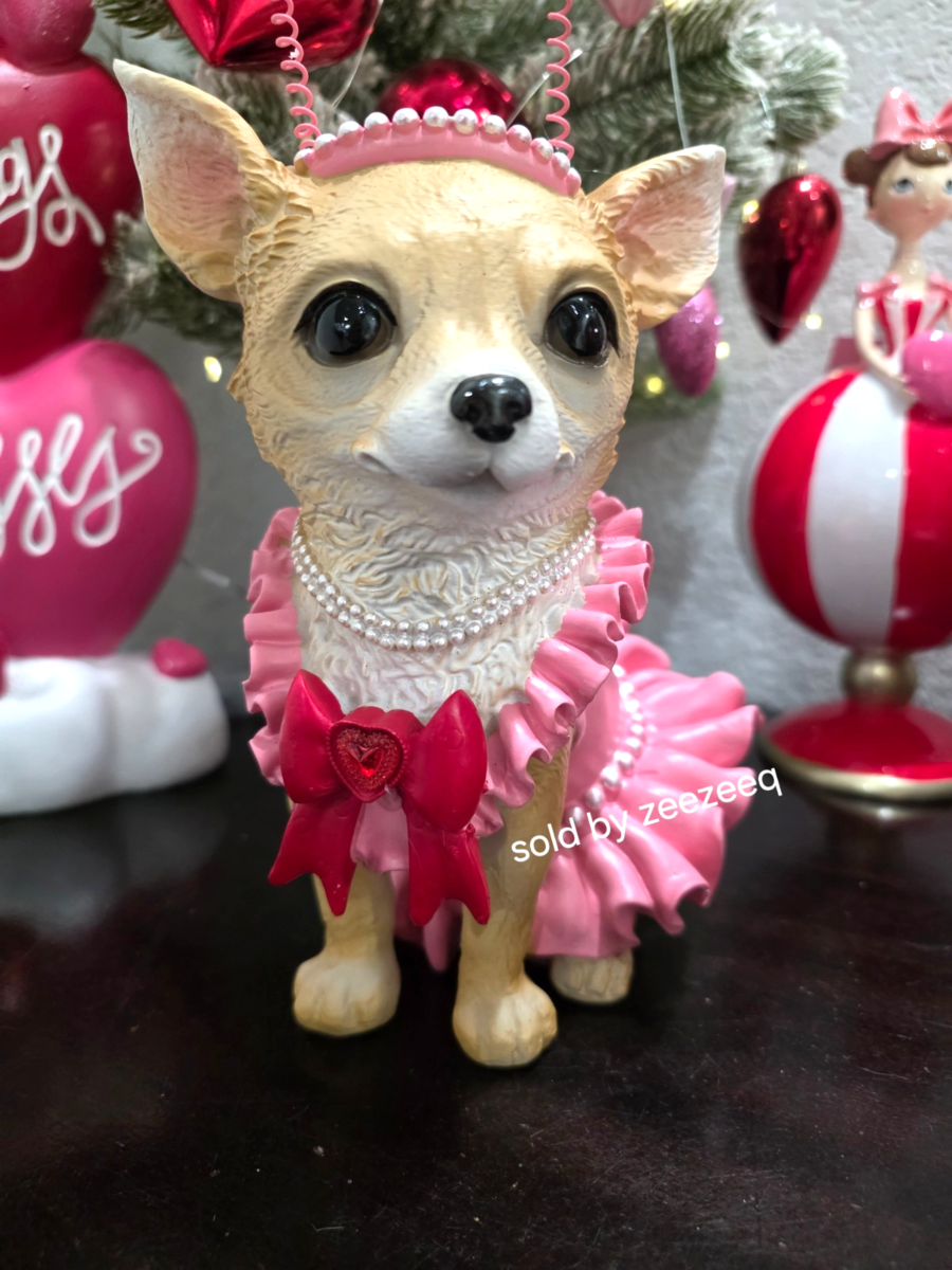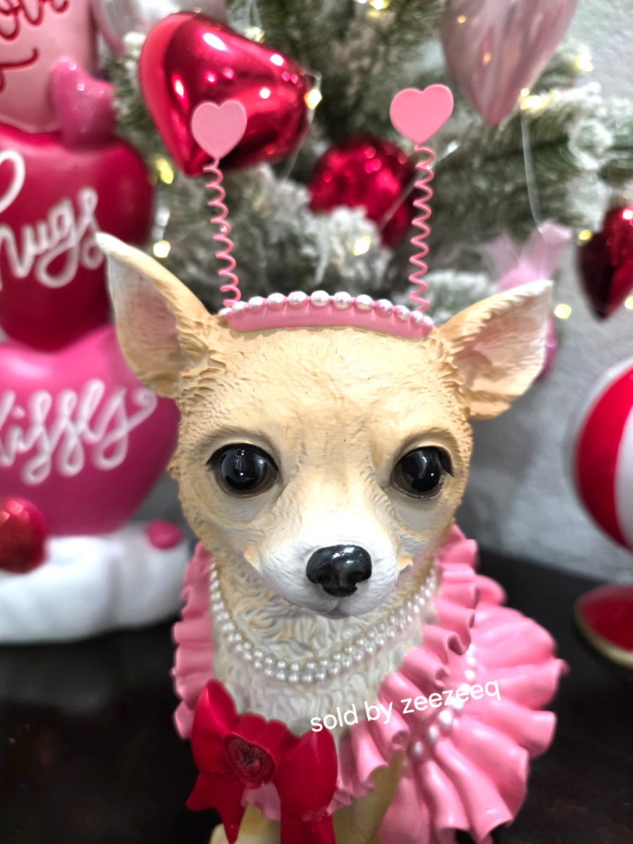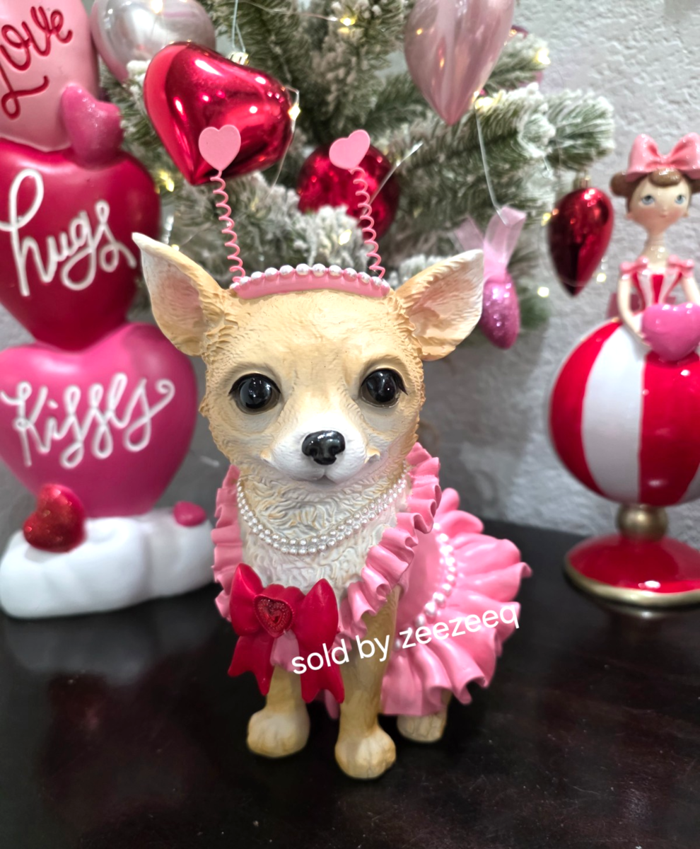 Up for sale we have this adorable Chihuahua for your Valentine's Day decor. This piece is sooo cute and it will look amazing with your decor. She is dressed in a pink dress with pearls around her neck and a red bow with a red gem. She is wearing a metal heart headback. She is too cute! Made of resin she measures approx 9.25". NEW