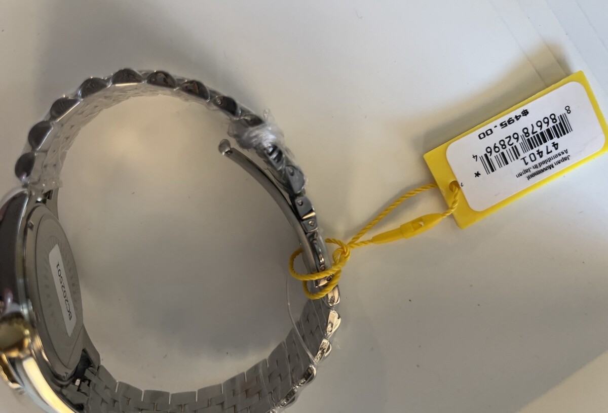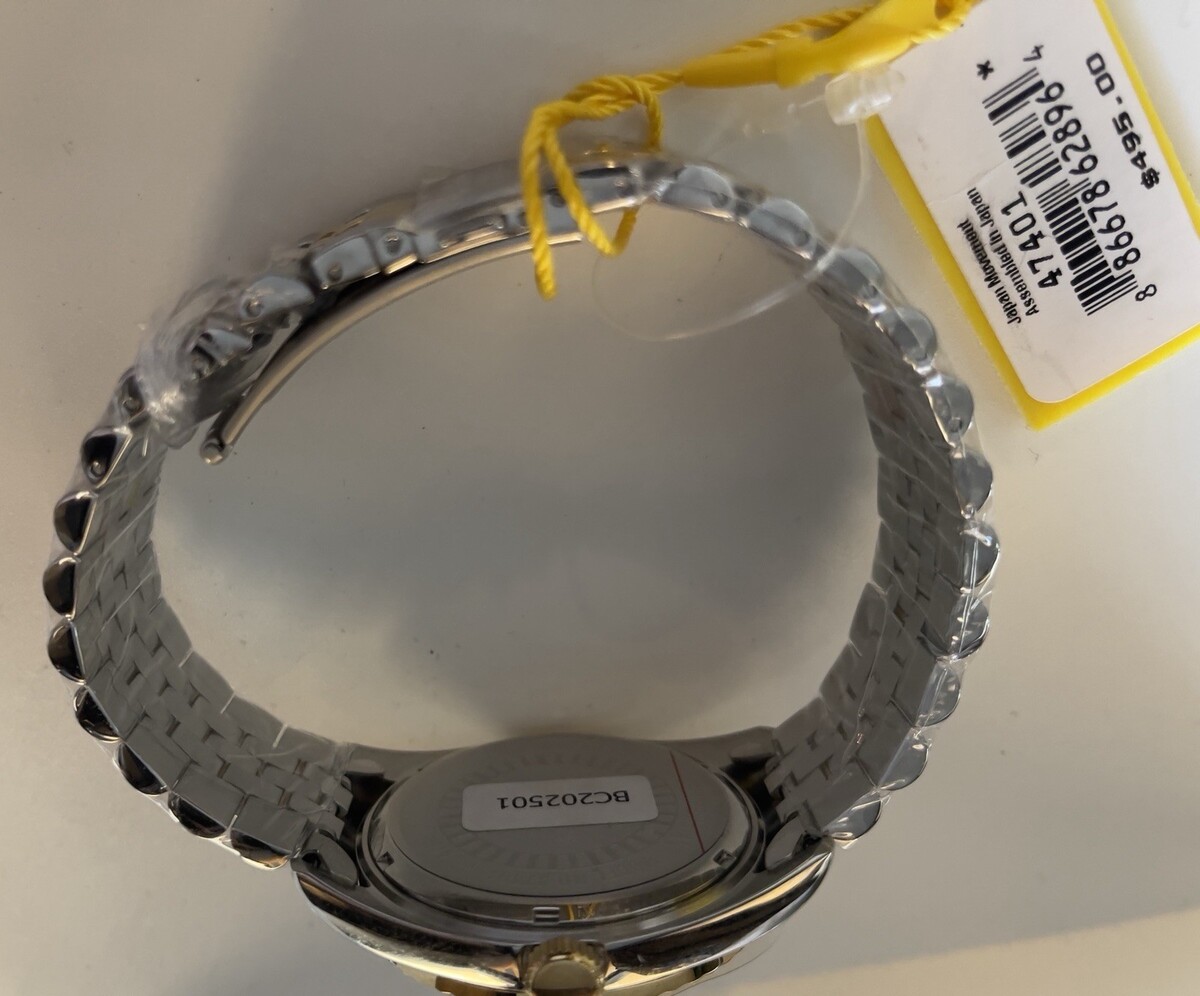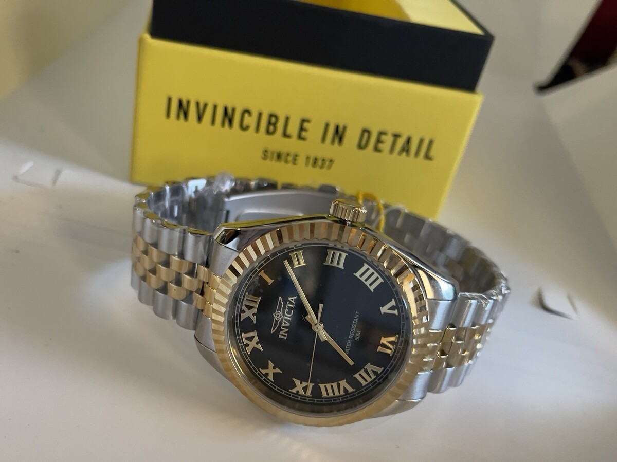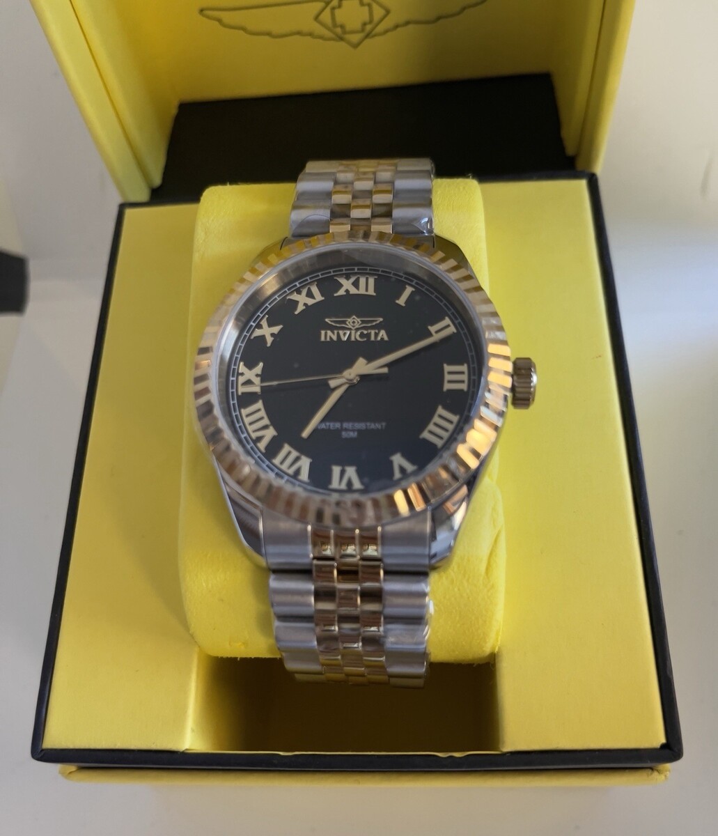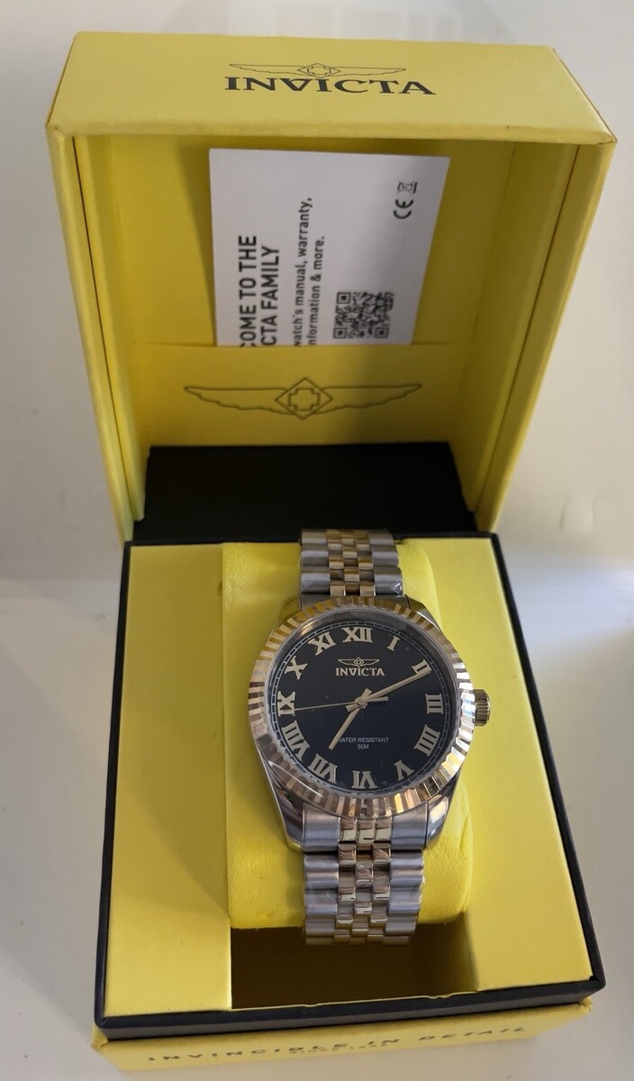 Black dial enhanced by gold-tone hands. Silver-tone stainless steel case with a two-tone (gold and silver-tone) stainless steel band. Quartz movement. 50 meters / 165 feet water resistance. Fixed Fluted bezel. Scratch Resistant Mineral crystal. Solid caseback. Fold over push button clasp. Pull / Push crown. Case size 43 mm x 10.50 mm. Band 22 mm x 7 incheslong. Invicta 47401 Specialty Watch.