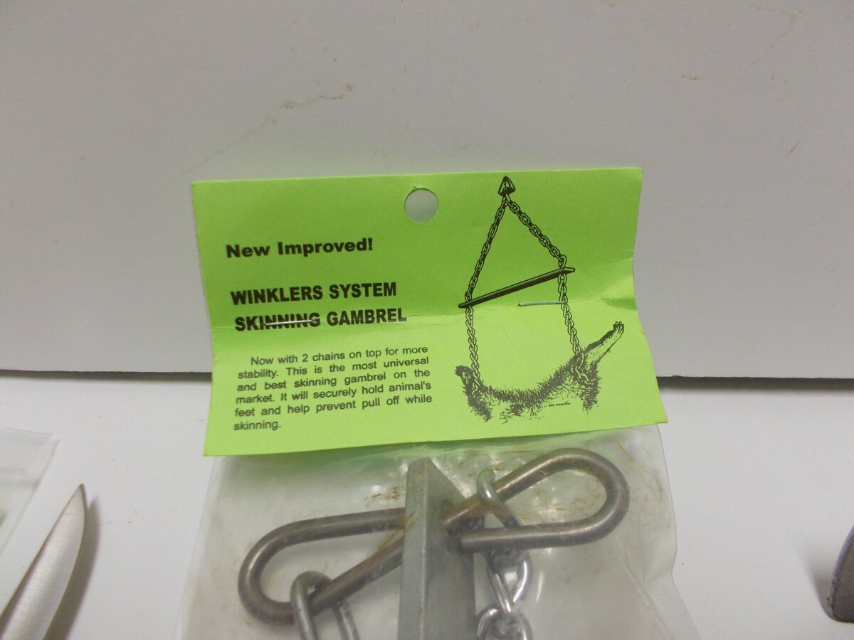 Up for sale is a deluxe fur handling/fur skinning kit. The kit contains a gambrel, skinning knife, tail stripper, tail zipper, fleshing tool, 12" fleshing knife, and 1 box of aluminum push pins.