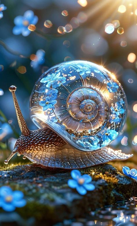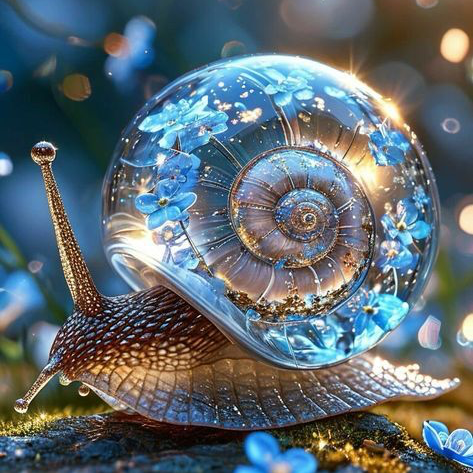 Lyria is a tiny wonder wrapped in a spiral of serenity — a delicate snail whose shell blooms like a sapphire flower, each petal-shaped whorl shimmering with morning dew. She moves with unhurried grace, leaving behind not an ordinary trail, but a silvery shimmer that feels like laughter caught in sunlight. Her presence is a gentle reminder that joy is not a rush, but a sweet unfolding, petal by petal.