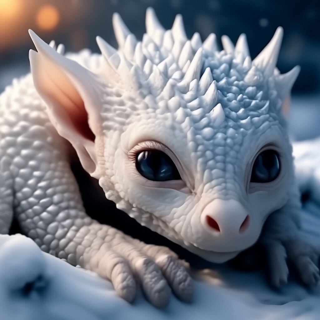 Small enough to fit in your dreams yet vast enough to fill your heart, Nara is a snow-pale baby dragon whose pearlescent scales shimmer like frost under moonlight. Her eyes are pools of curious silver, always watching, always learning. Tiny wings, still soft at the edges, beat with a feathery whisper, and her little tail curls like a question mark when she’s curious, which is almost always.