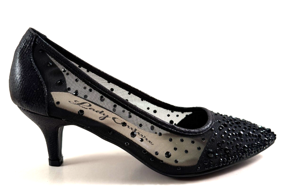 The Lady Couture Silk Black Pointed Toe Mid Heel Dressy Embellished Pump is a sophisticated and elegant women's shoe perfect for special occasions such as weddings, parties, or formal events. Featuring a pointed toe, slip-on closure, and a kitten heel, these heels are adorned with rhinestones for added sparkle and glamour.