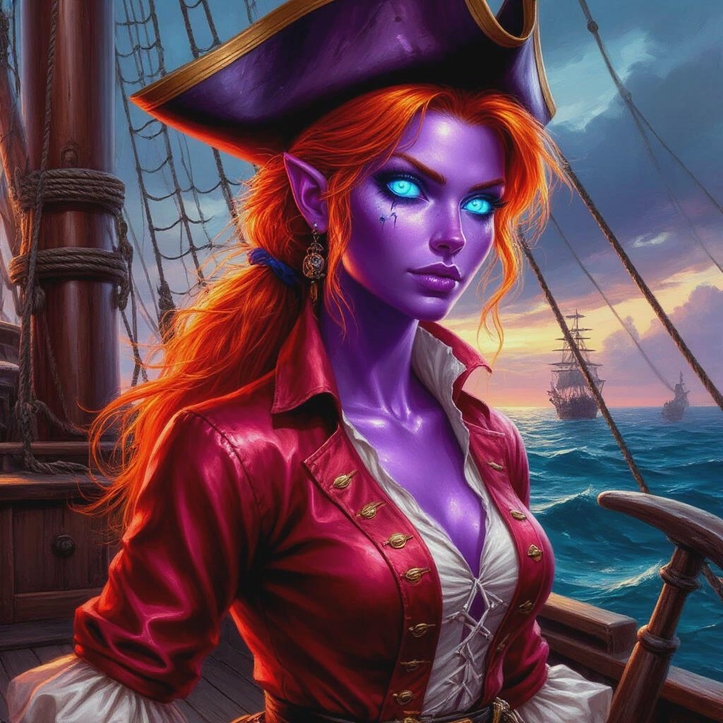 Once a feared pirate of the Eastern Seas, Seraphine Veyra was unmatched in daring and cunning. Her fiery red hair and piercing light-blue eyes once dazzled the sunlit decks of her ship, the Crimson Wraith. But fate - or perhaps the envy of vengeful spirits - cursed her: her skin turned a deep, violet hue, ethereal and otherworldly, marking her as both beautiful and untouchable. Some say the curse binds her to the sea, to roam eternally where wind and waves obey her whim. Others whisper that the curse is not punishment, but a sign of her soul’s unmatched power.