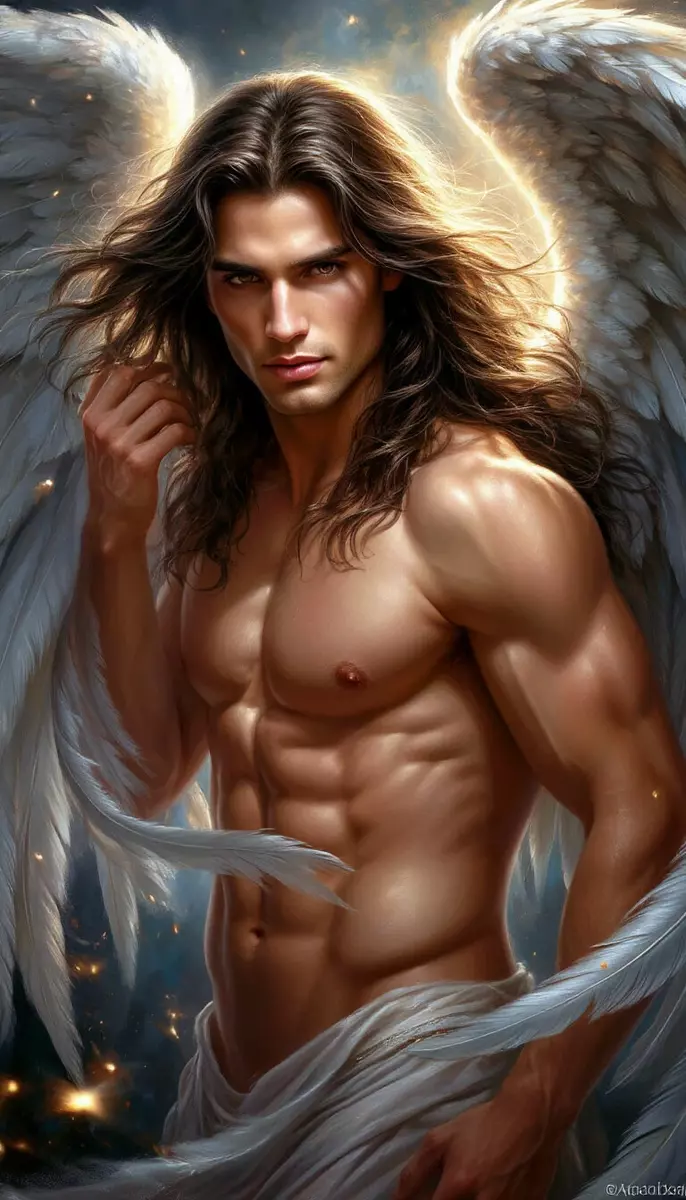 Once a celestial being of light, Damien fell not for sin, but for the irresistible call of desire and the depth of mortal emotion. His black wings, broad and shadowed, stretch like velvet night, a stark contrast to his naked, sculpted torso — every movement a study in strength, grace, and allure. His dark hair falls carelessly over strong features, framing golden eyes that smolder with temptation and knowing intensity.