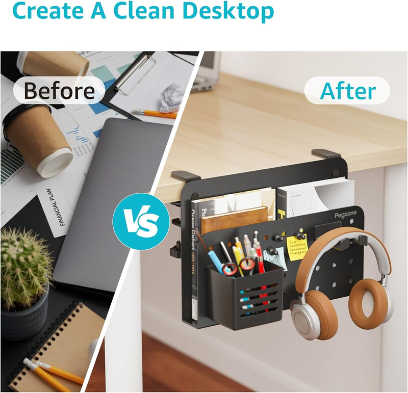 EFFICIENT SPACE UTILIZATION: Crafted from premium metal, this under desk organizer features a unique design that includes various pegboard accessories. It offers ample desk side storage for laptops, tablets, notebooks, folders, stationery, and more, effectively tackling desktop clutter.