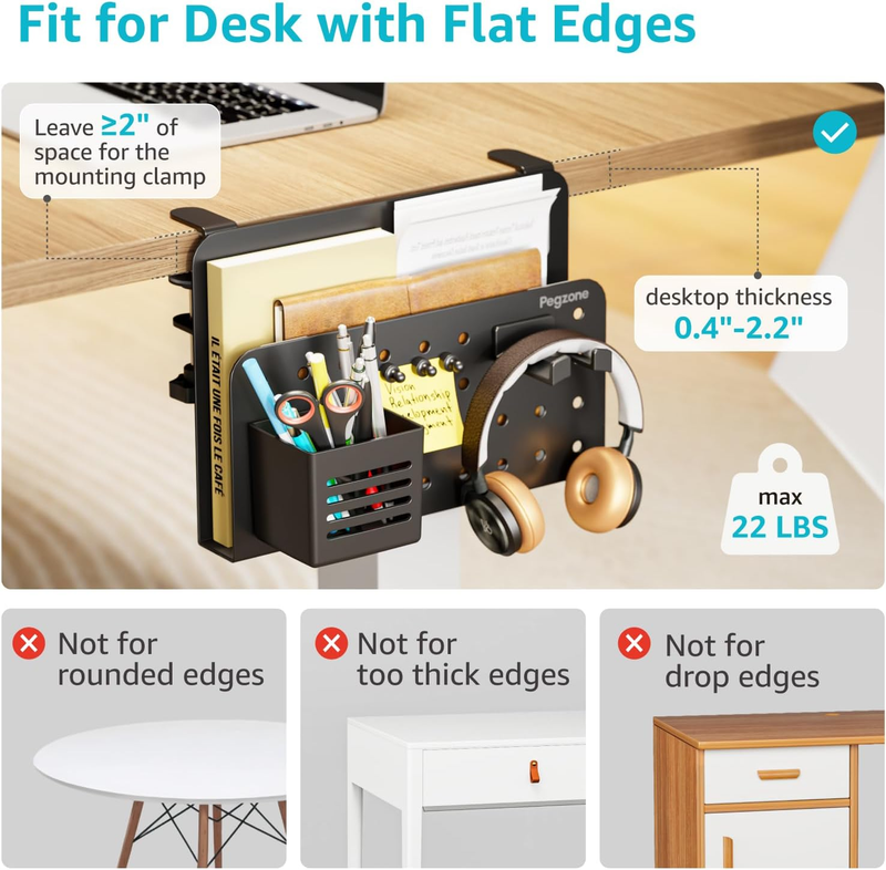 Desk Side Storage Organizer, No Drill under Desk Laptop Holder, Clamp on Desks Shelf with Pegboard Accessories, Hanging Laptop Mount, Fits Flat Edge 0.4" to 2.2", Black