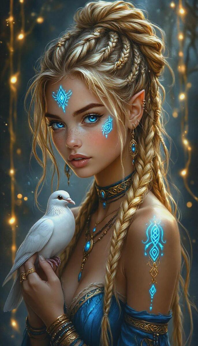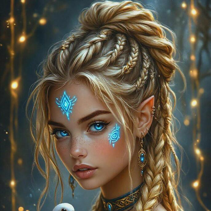 Serelith glows like the first morning light. Her golden-blonde hair is intricately braided, adorned with delicate golden jewelry that catches the sun. Her porcelain skin shimmers with faint glowing blue marks across her forehead, cheeks, and arms, forming celestial patterns that pulse gently with magic. Her piercing blue eyes reflect calm, wisdom, and serenity. When she moves, a soft aura of light surrounds her, and the scent of jasmine and fresh air lingers in her wake.