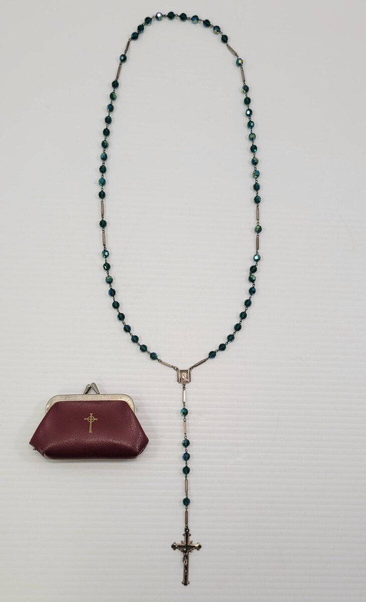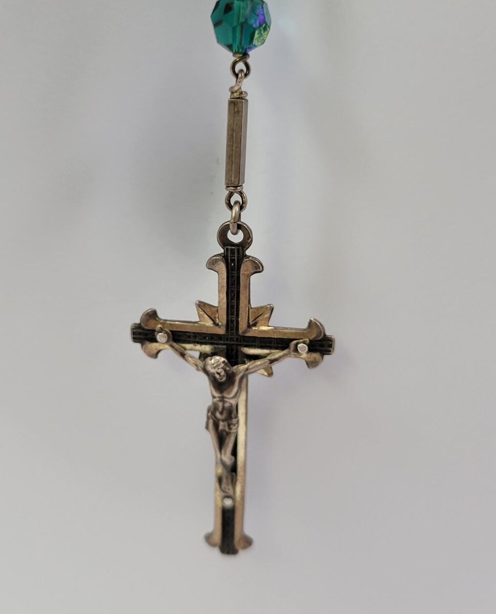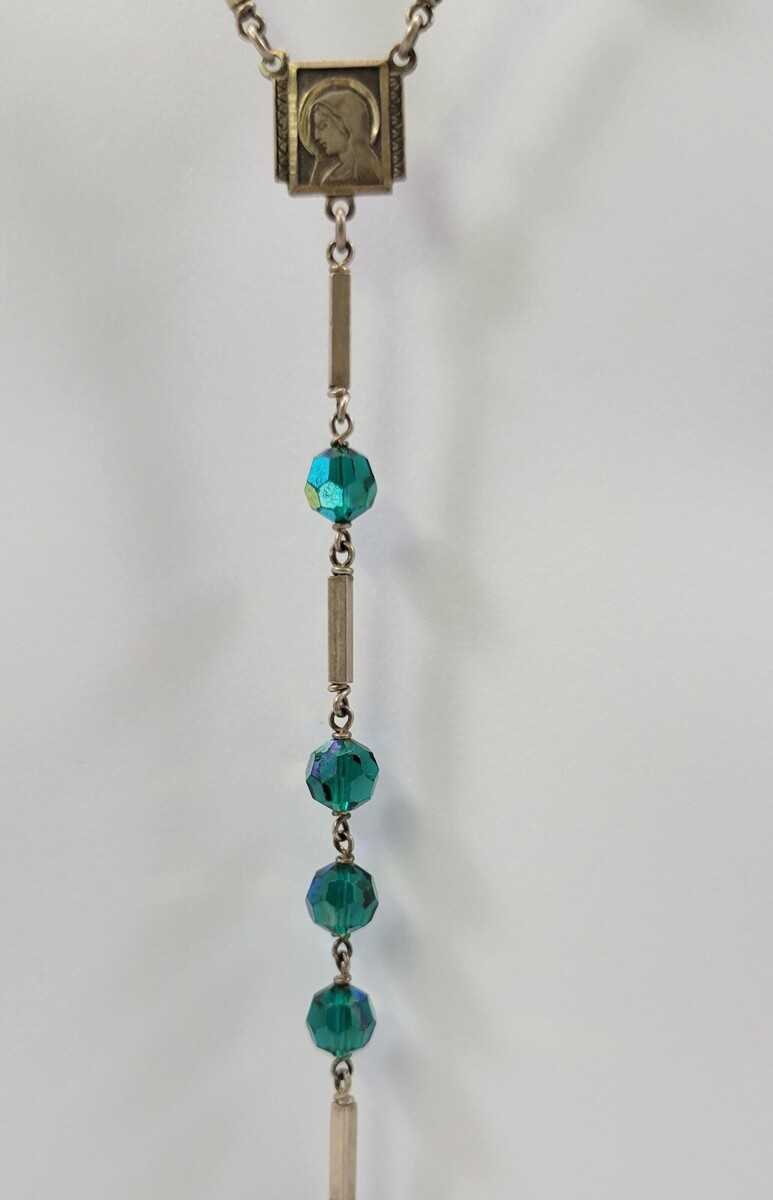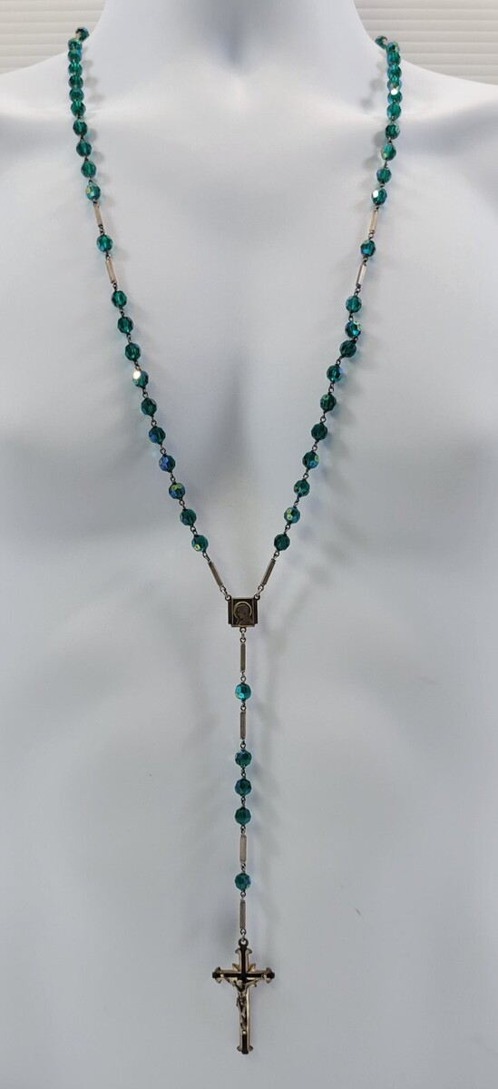 Iridescent Multifaceted Green Crystal Miraculous Medal of the Immaculate Conception Rosary Prayer Beads