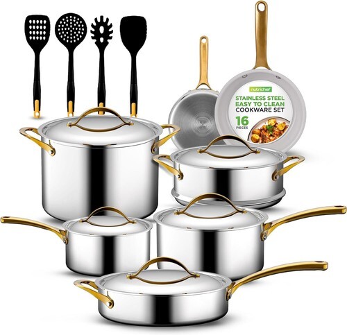 NutriChef NCSTS16 Kitchenware Pots Pans 16-Piece Set-Gold (Open Box)