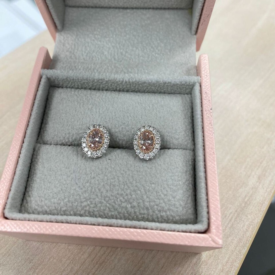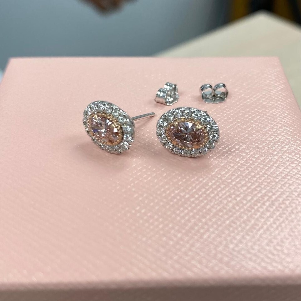 These elegant earrings feature oval brilliant-cut lab-grown pink diamonds surrounded by a shimmering halo of smaller colorless diamonds. Set in high-quality 14k white gold, the earrings are designed with post studs and a secure push-back closure for comfort and ease! With their dazzling pave setting, these earrings make a perfect choice for weddings or any special occasion, adding a touch of timeless elegance to any look!!