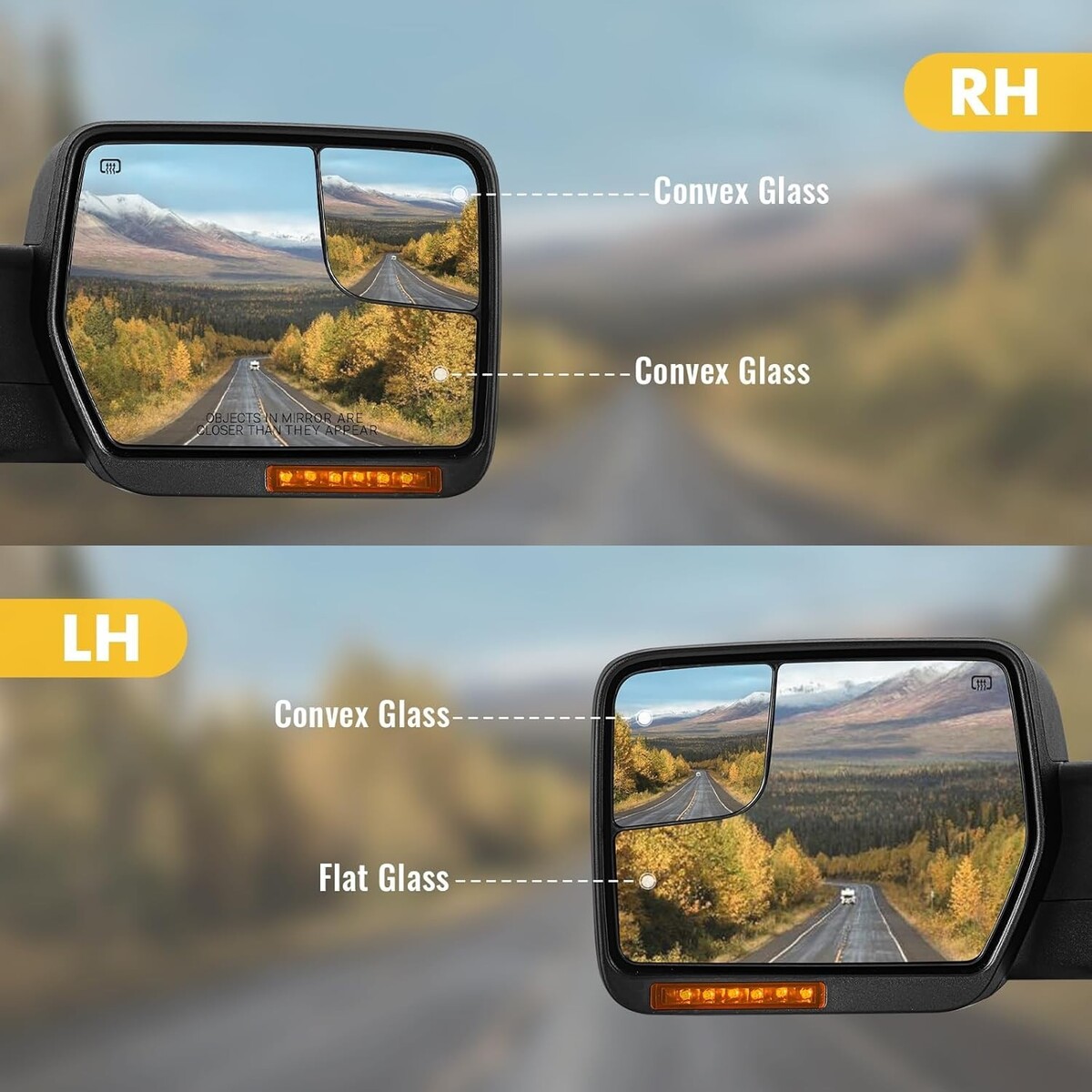The left side mirror contains a flat mirror with a convex mirror, and the right mirror is both convex mirrors. These dual mirrors work together to make your driving safer