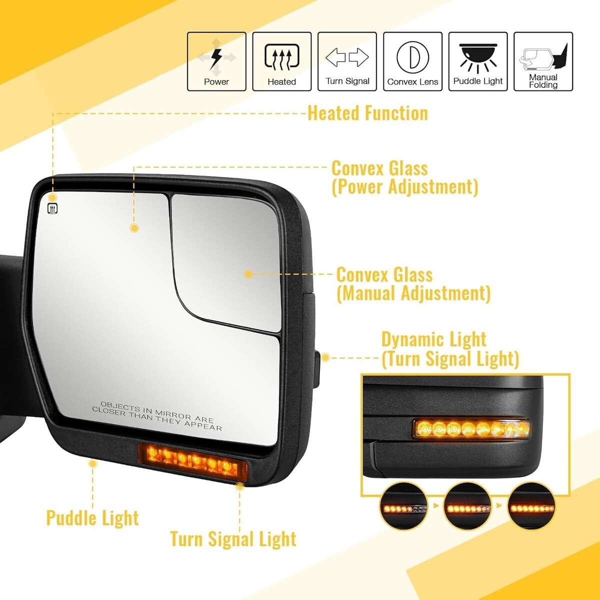 Adjustable power glass; dual Glass (flat Glass and convex Glass); dynamic turn signal light; puddle light; manual folding
