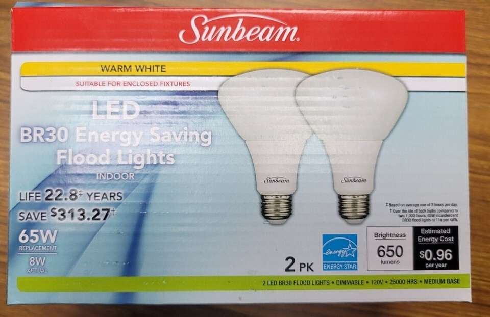 (Pack of 2) Dimmable Sunbeam LED Flood Light Bulbs BR30 65W Replacmnt Indor