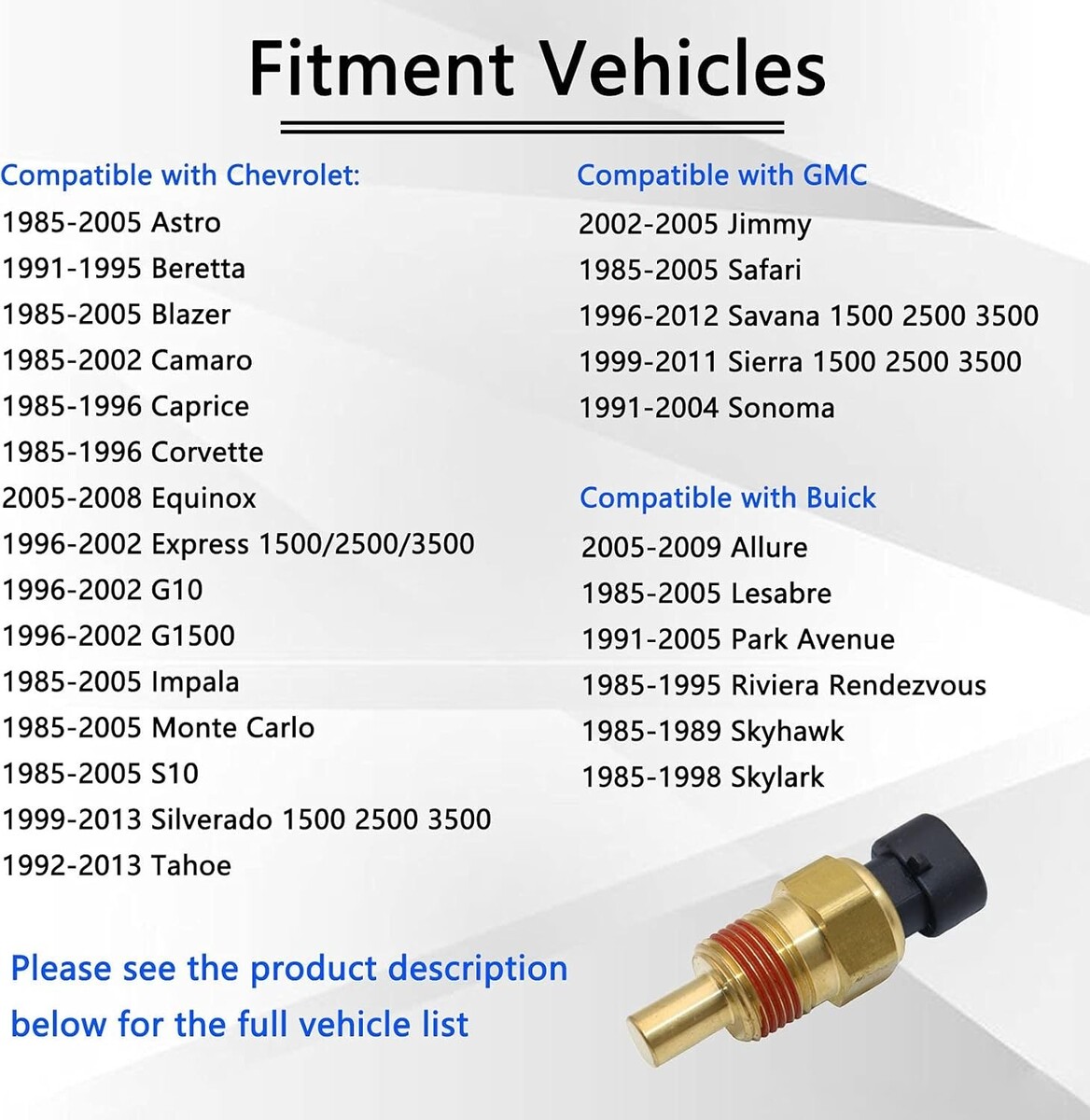 1992-2005 for Chevy Astro, 1985-2005 for Chevy Blazer, 1992-2000 for Chevy C1500 C2500 C3500, 1996-2002 for Chevy Express, 1985-2005 for Chevy Impala, 1997-2003 for Chevy Malibu, 1985-2005 for Chevy S10, 1999-2013 for Chevy Silverado, 1992-2013 for Chevy Tahoe, 1997-1998 for GMC Jimmy, 1999-2011 for GMC Sierra, 1992-1999 for GMC Yukon, 1985-2004 for Buick Century, 1985-2005 for Buick Lesabre, 1999-2002 for Oldsmobile Intrigue, 1985-2005 for Pontiac Bonneville and more.