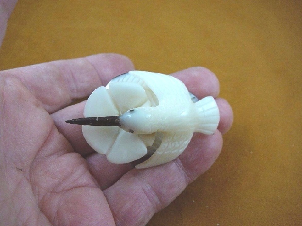 (#TNE-BIR-HU-517A) Beautifully hand crafted tagua nut figurine of a little white HUMMINGBIRD over flower (1 piece), underside also hand-made with leaves together. Measures 1" tall x 1-3/4" wide x 2-1/2" long. Nice detail.