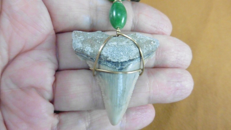 (internal #SR229-1) Fossil Angustidens shark tooth is 1-3/4" gold tone wired, on 19" green jade and black hematite bead necklace, nice tooth. Great affordable gift for the shark lover!