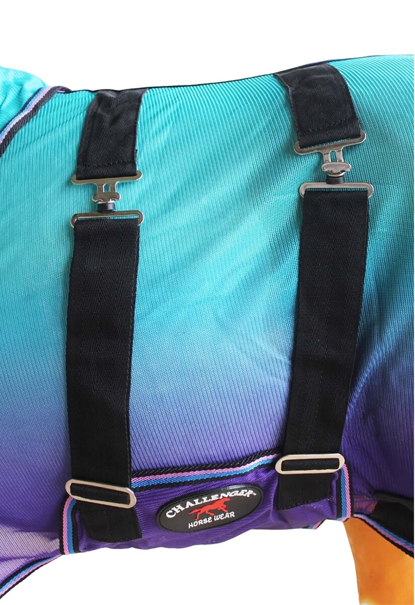 Challenger combo fly sheet with detachable neck made from brethable soft poly nylon mesh which allows for air circulation. Sheet provides protection for your horse against dangerous insects, bugs, and UV rays. Dual front buckle closure, adjustable surcingles, and elastic leg straps help secure sheet in place. Tail cover offers added protection. Shoulder gusset offers freedom of movement. Features rust-free stainless steel hardware.