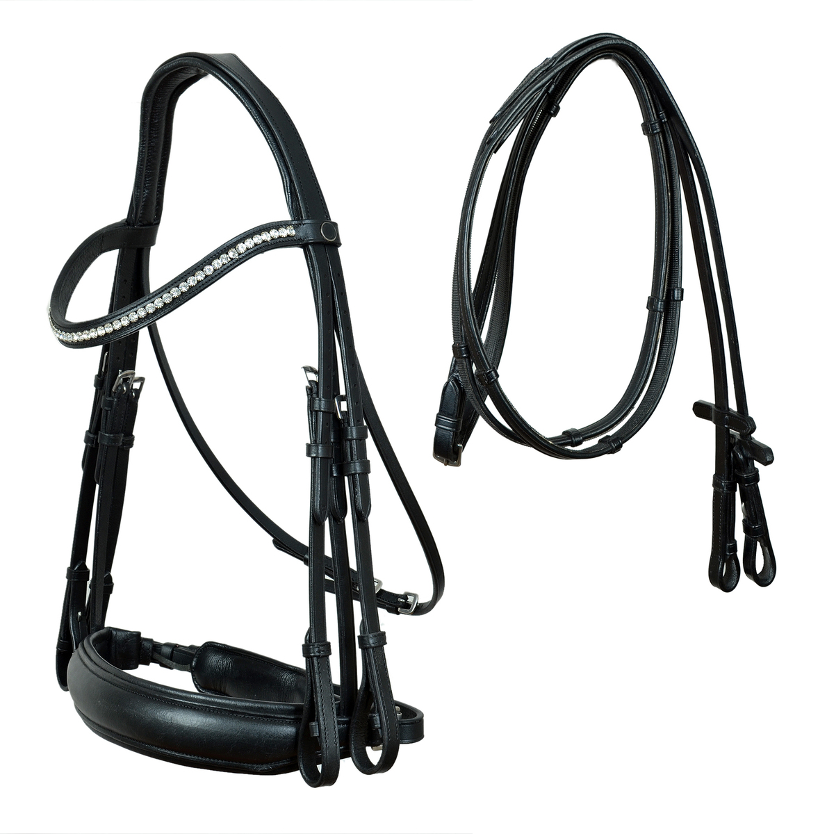 Challenger All-Purpose English bridle crafted from high-quality black leather is perfect for everyday use. Comes fully padded for comfort, and accented with clear rhinestones along browband. Features non-rust stainless steel hardware. Bridle includes matching 8' 10" nylon reinforced reins with leather stops and hook bit ends. Size: Full