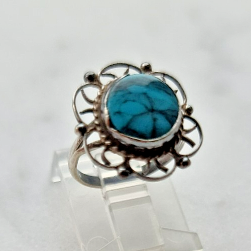 VINTAGE SOUTHWEST STYLE 925 STERLING SILVER BLUE TURQUOISE FLOWER RING SIZE 3.5