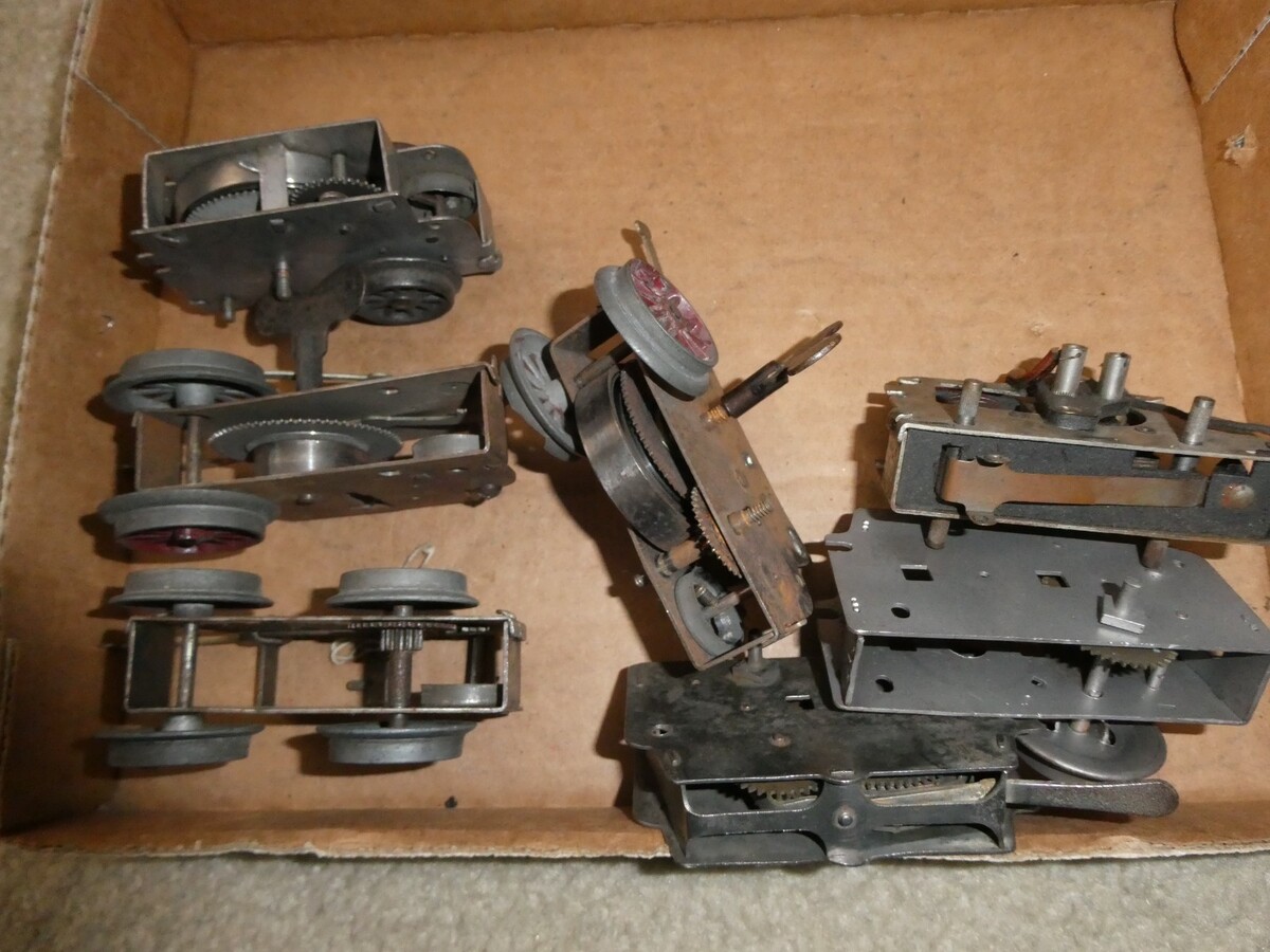 You are bidding on an older, postwar, lot of 7 O or O27, mostly windup locomotive motor assembly type unit with chassis or frames as shown, in the pictures. Very good shape, general wear from use, frames as shown, all missing parts, motor components come as shown. Unknown working condition so sold for parts or repair as shown. Zoom in for details.