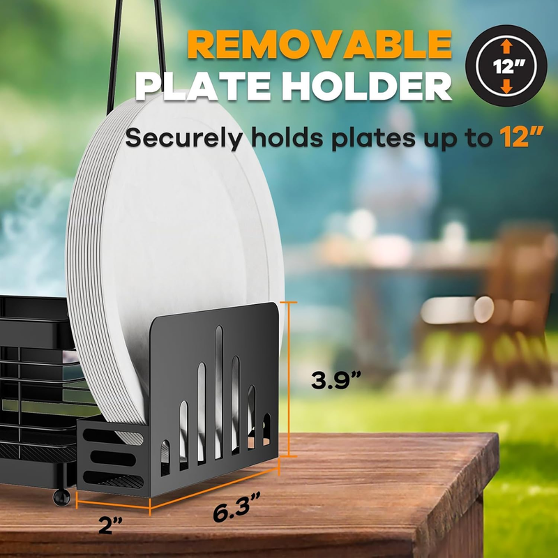 Grill Caddy with Plate Holder and Paper Towel Holder, Picnic BBQ Condiment Utens