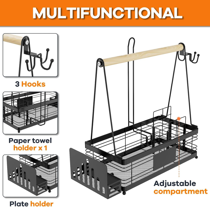 ?One Caddy Carry All? - Caddy features 4 compartments with a paper towel roll holder, a removable plate holder, 2 adjustable compartment dividers and 3 hanging hooks. Keep all your grill accessories picnic tools camping supply, cleaning products all together without taking up much space. Easily hold spices, travel condiments, plate, cutlery, napkin, paper towel roll, grill tools, spoon, camping cups and more