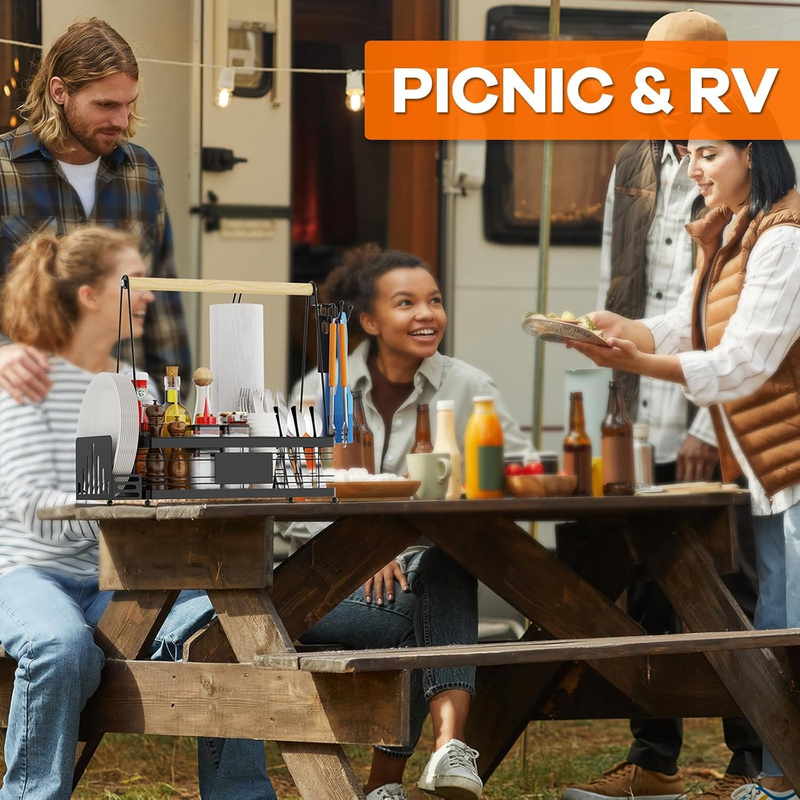 Grill Caddy with Plate Holder and Paper Towel Holder, Picnic BBQ Condiment Utensil Organizer Caddy for Outdoor Cooking, Camping Essential, Camper Must Haves, Grilling Gifts for Men