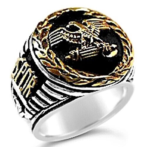 Hand Crafted Signet ring ...*Gold detailed 3-D r sculpted Roman eagle atop fasces, framed in laurel wreath .....Aprox. Dimensions,Outside frame: (0.86"/22.0mm)across....Sterling silver bottom,2 SPQR sides make this a one of a kind ring designs....Sits flat on finger No concave parts...has feel of Collegiate ring!!!!!...,worked silver shank....Vintage Antique finish,........state your finger size(9-14),