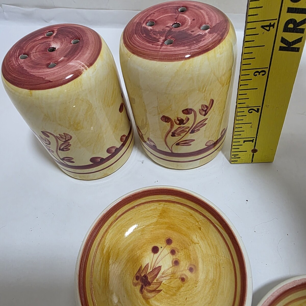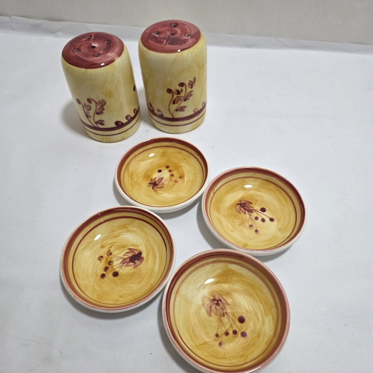 The vintage 6-piece set of 2 pasta cheese / Salt Pepper-shakers and 4 dip bowls from The Main Ingredients is a charming addition to any kitchen or dining area. Made of high-quality porcelain and ceramic materials, these dipping bowls feature a mustard color with red flower detail, adding a touch of elegance to the set. Ideal for serving cheese or other dips, this set is perfect for those who appreciate Italian-themed kitchen decor. Imported from China, these bowls are a unique and stylish way to serve your favorite dips and cheeses.