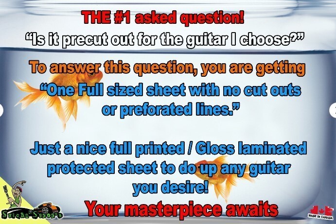 We also offer 9" x 12" sheets for pickguards/headstocks, and we can custom-size skins for bass, acoustics, Jumbo, Explorers and Left-handed oversized guitars. Just message us with your dimensions before ordering oversized