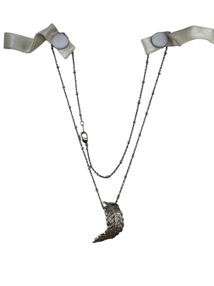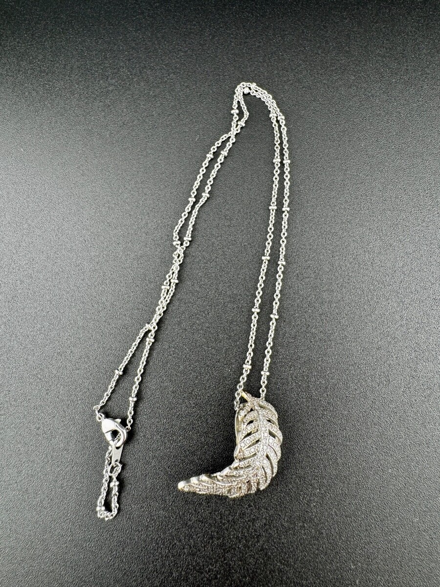 This is an antique curved feather diamond pendant made from either 14k or 18k white gold. Although it is not marked, it has been tested and confirmed to be solid gold throughout. The pendant features antique single-cut natural diamonds, which enhance its vintage style.