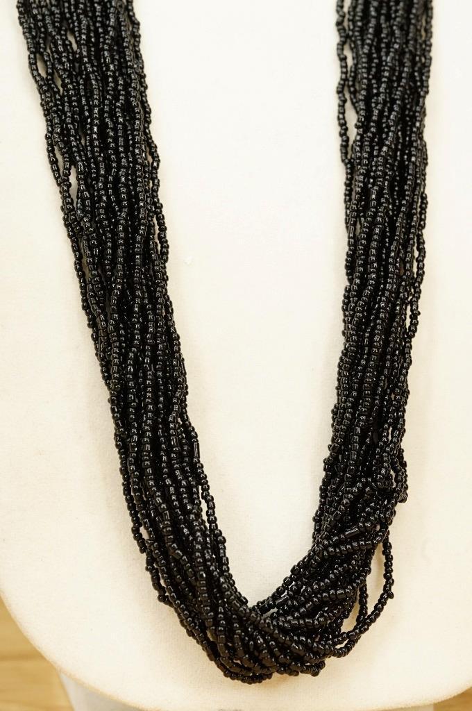 Artisan Jewelry Black Glass Seed Beaded Multi Strand Statement Necklace 36" wrapped soft cotton corded backpiece for comfortable wear. No smoke or pet odor.