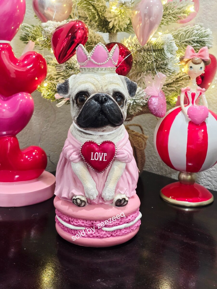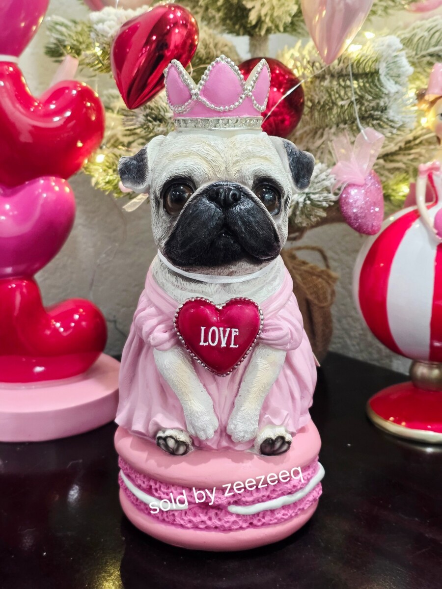 Up for sale we have this adorable pug for your Valentine's Day decor. This piece is sooo cute and it will look amazing with your decor. She is wearing a pink dress with a pink heart crown. She is too cute! Made of resin she measures approx 10". NEW