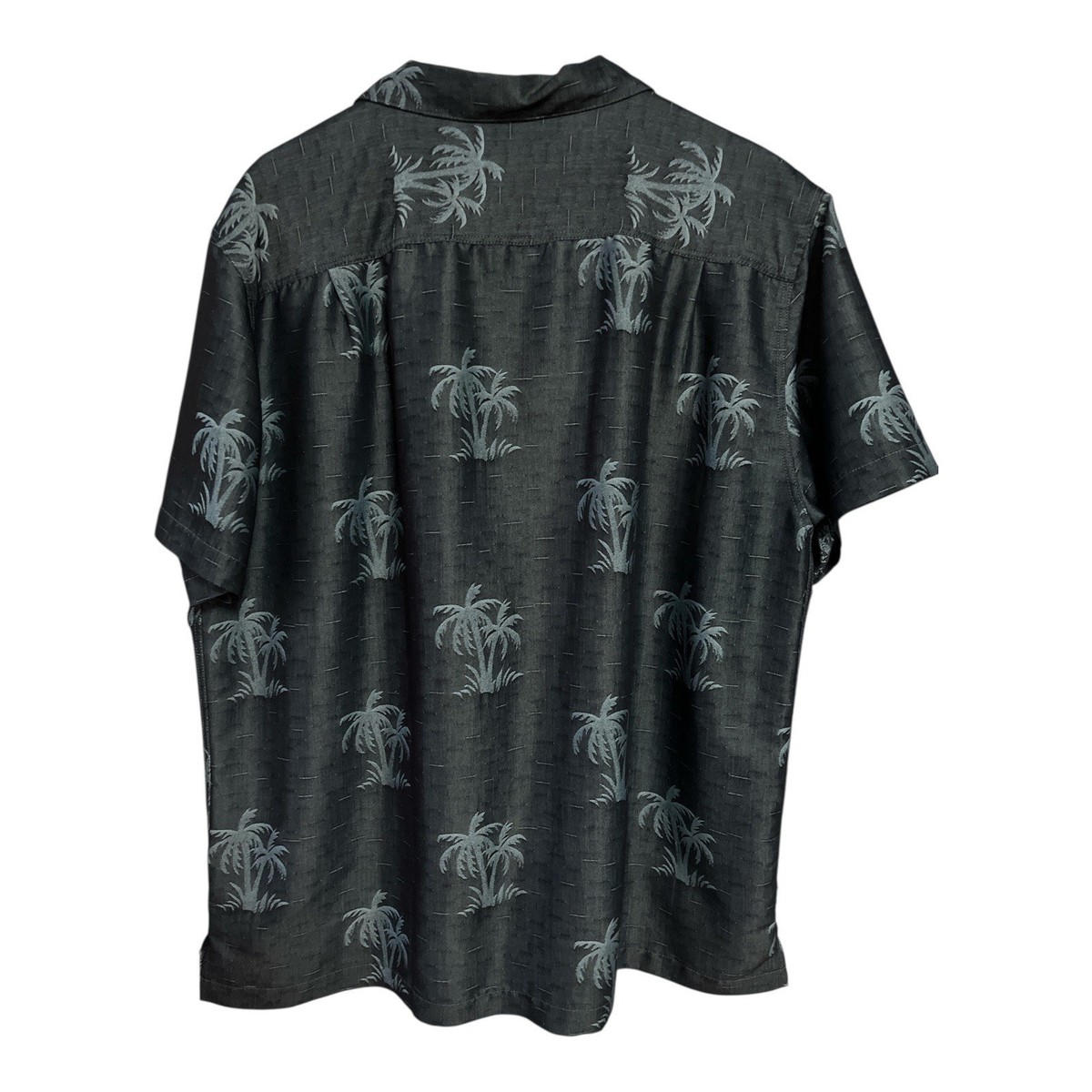 Men?s short-sleeve button-up shirt by Banana Split USA featuring an allover palm tree print in muted blue-gray tones on a charcoal background. The fabric has a **subtle sheen**, giving it a slightly dressier, polished look while still feeling lightweight and relaxed. Great for casual wear, resort styling, or Y2K-inspired outfits.