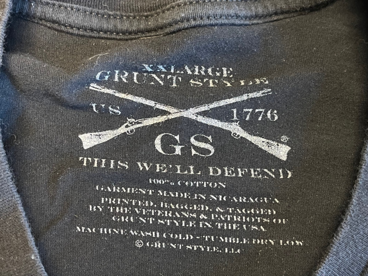 Grunt Style 100% cotton Jolly Roger graphic T?shirt in men?s XXL, featuring Grunt Style?s skull/flag design on a soft crewneck tee. Pre?owned with normal light wear and no major flaws noted, perfect for everyday patriotic casual wear