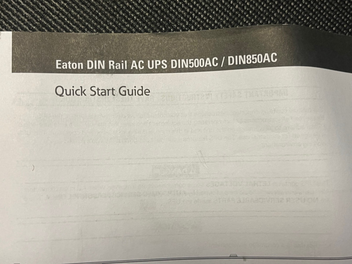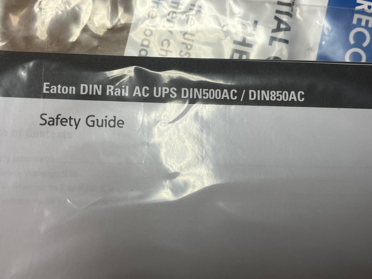 Eaton DIN850AC 850 VA / 510 W 120 V AC DIN?rail industrial UPS with hardwired input/output, internal VRLA battery, and USB monitoring, designed for factory and machine?control panels. Brand new unit including cord/lead and manual, ideal for protecting PLCs, networking gear, and other control equipment from outages and line disturbances.