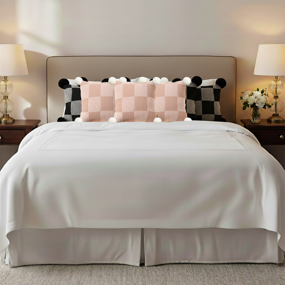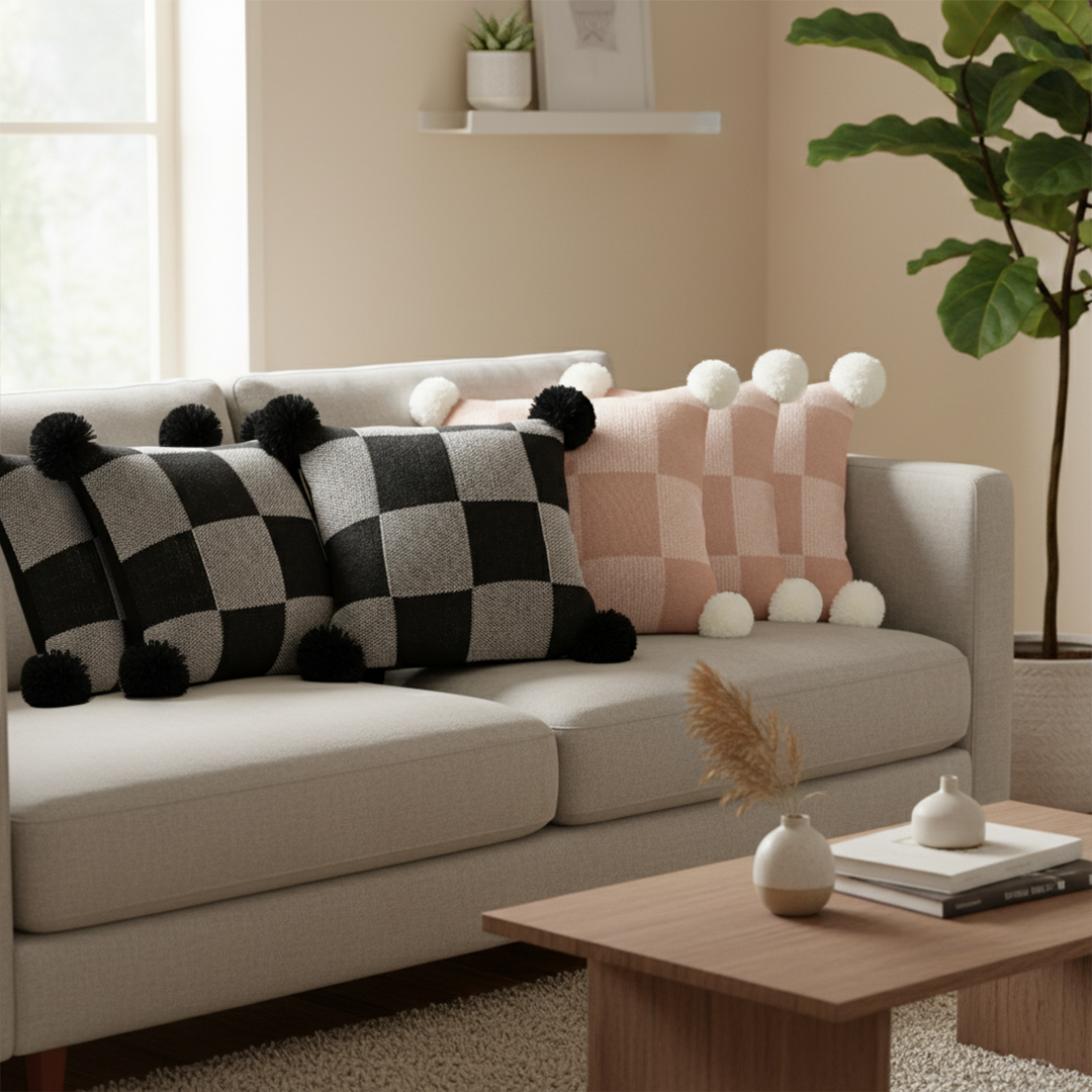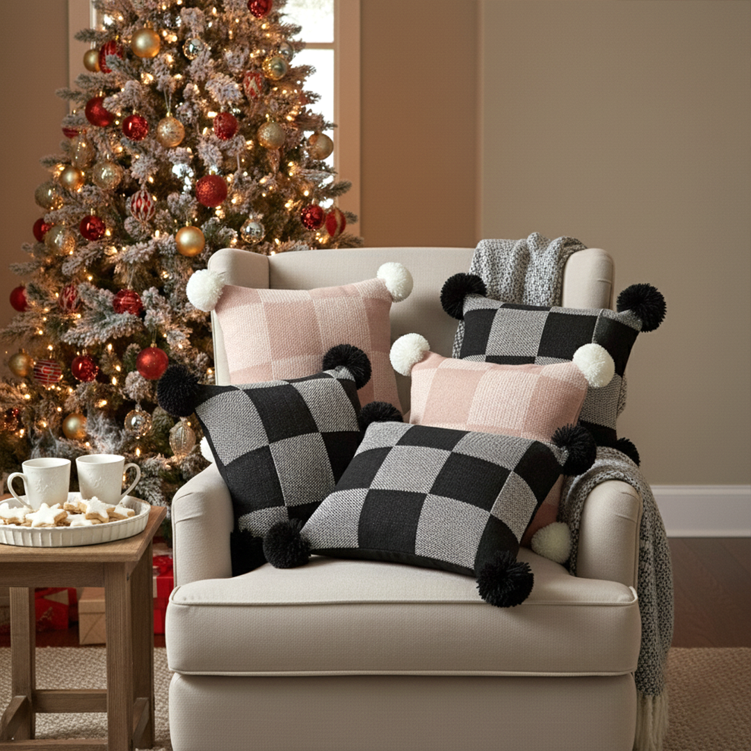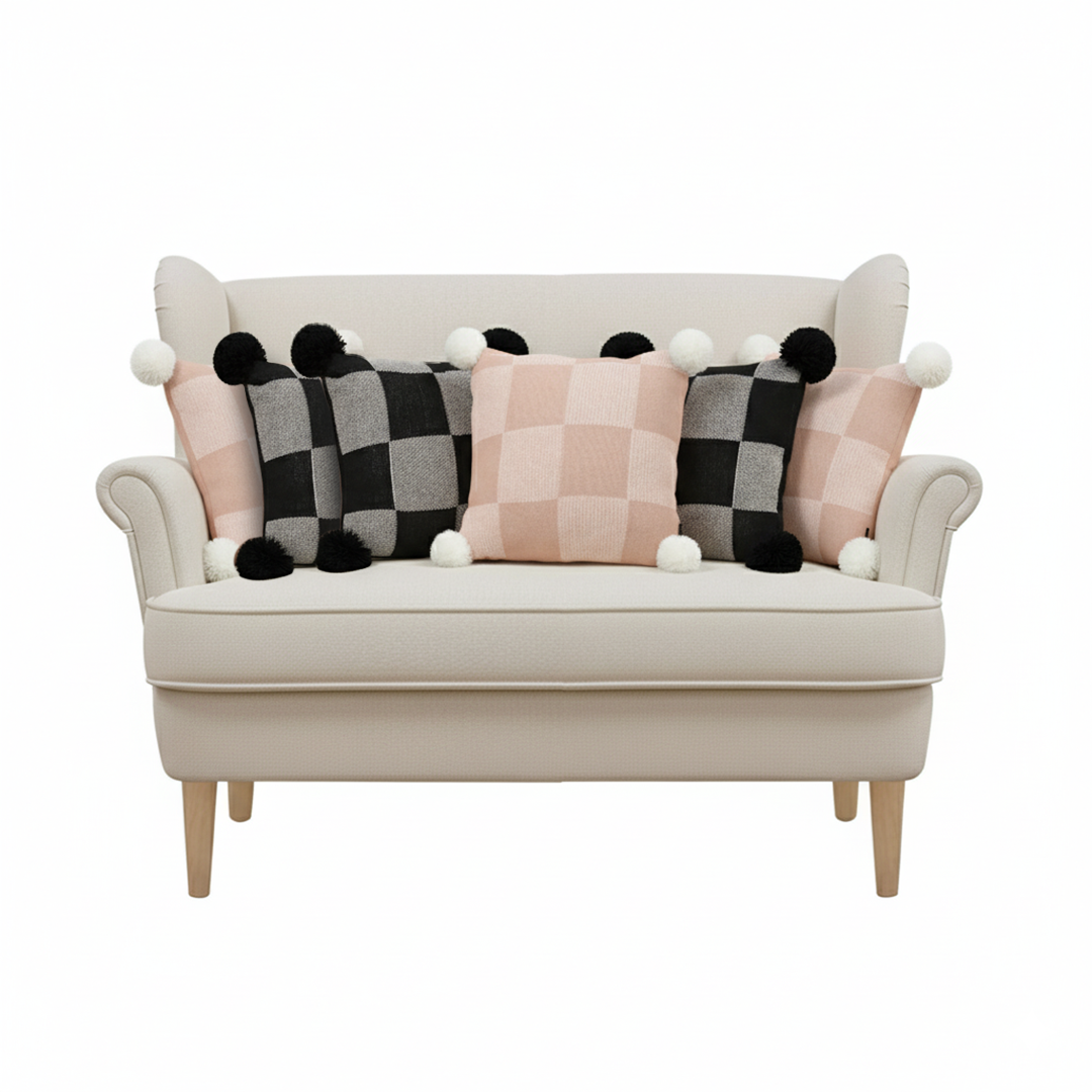 Includes 6 decorative pillow covers: black, pink gray gingham with pom-poms and cozy checkerboard knit designs