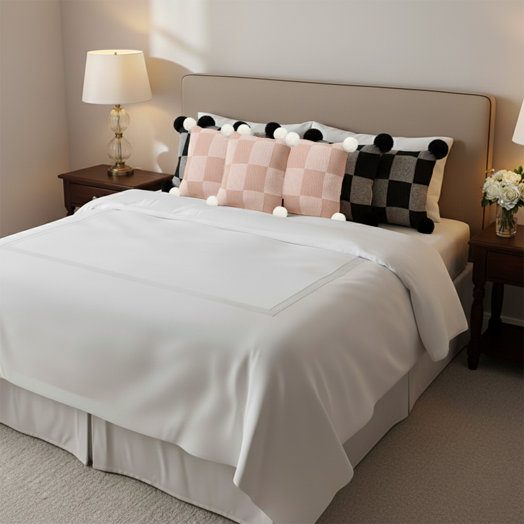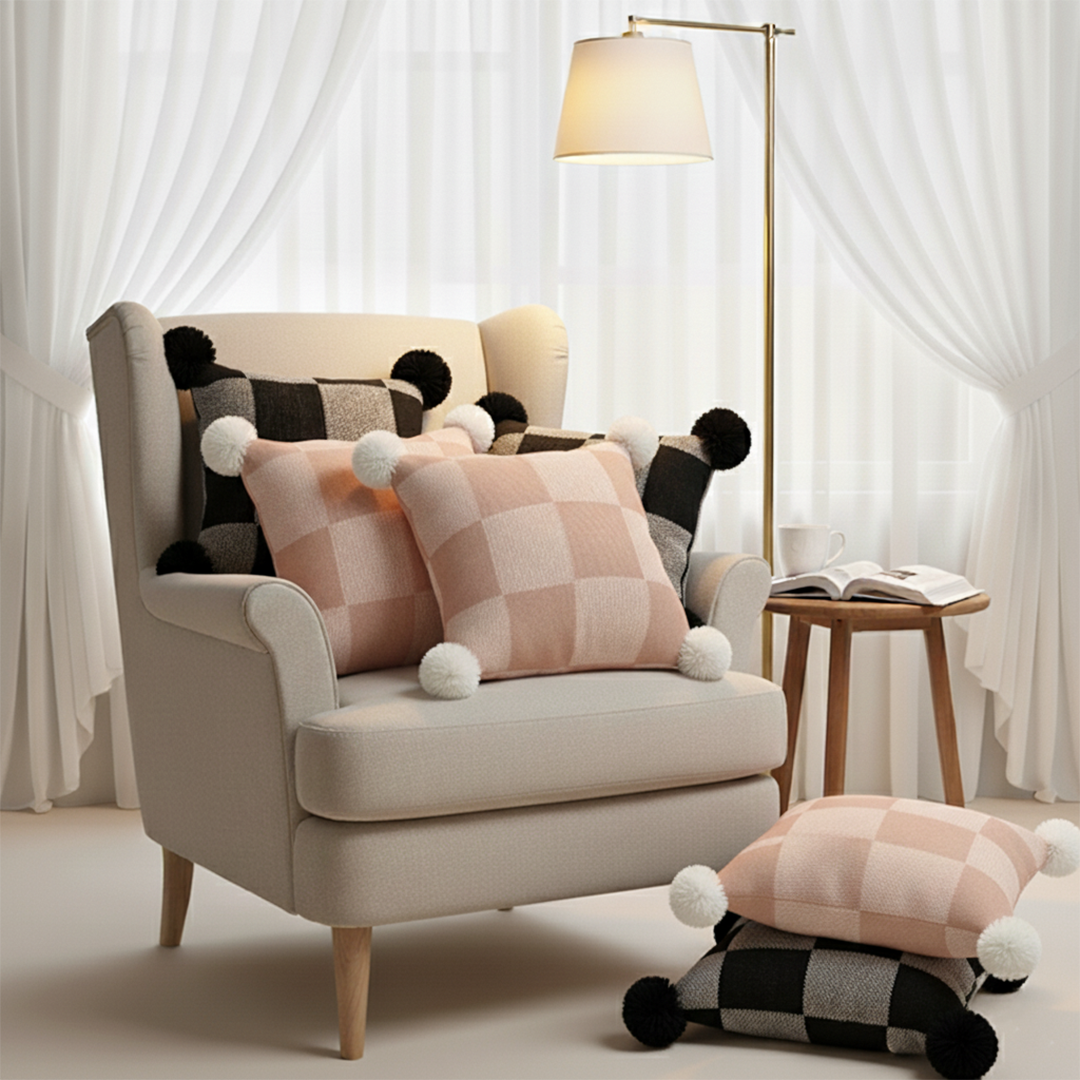 Add a cozy and stylish touch to your home with the SOGA 6PC Pillowcase Set, featuring modern black, pink, and gray gingham designs with playful pom-poms, paired with soft checkerboard knit pillow covers. Perfect for sofas, beds, or lounge areas, this set combines contemporary charm with cozy texture.