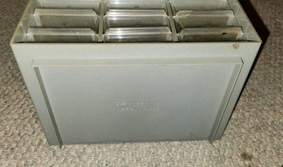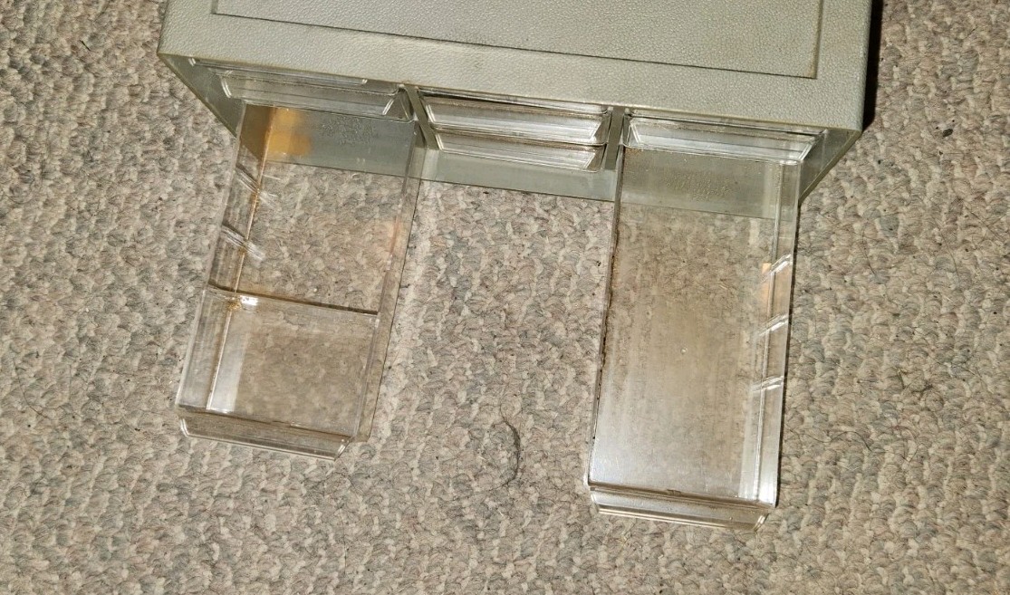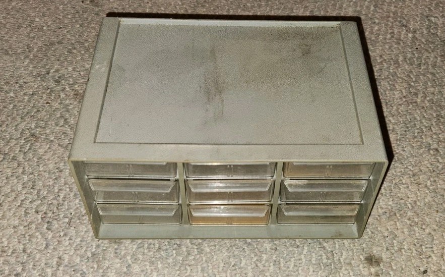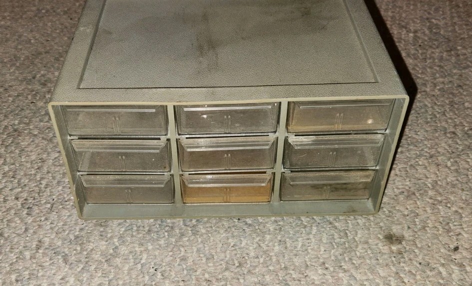 Has some wear from use. Vintage drawers. Plastic. Acro-mils. 9 drawer. 9 inches wide 5 inches tall.