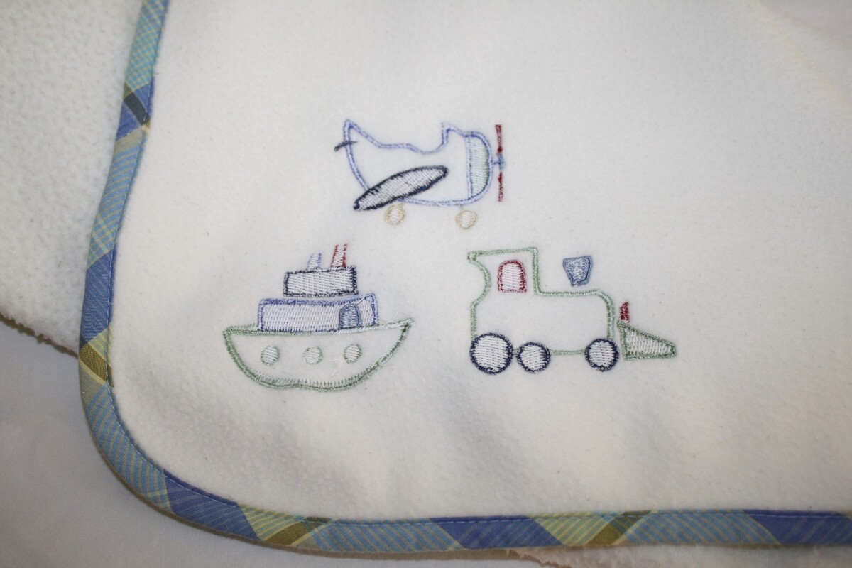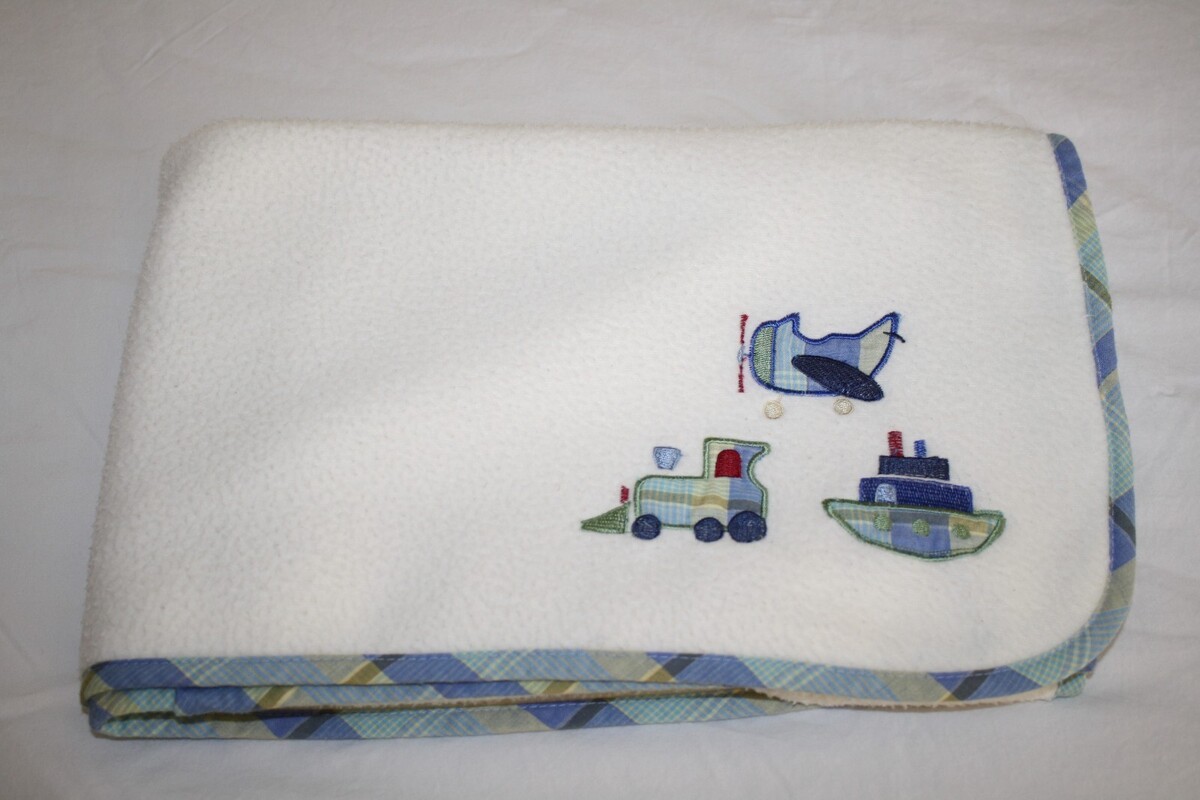 Koala Baby, Babies R Us, Plaid Trim Edge, Blue, Green, Cream Baby Blanket, Plaid Applique BOAT, PLANE, TRAIN, Fleece PLUSH