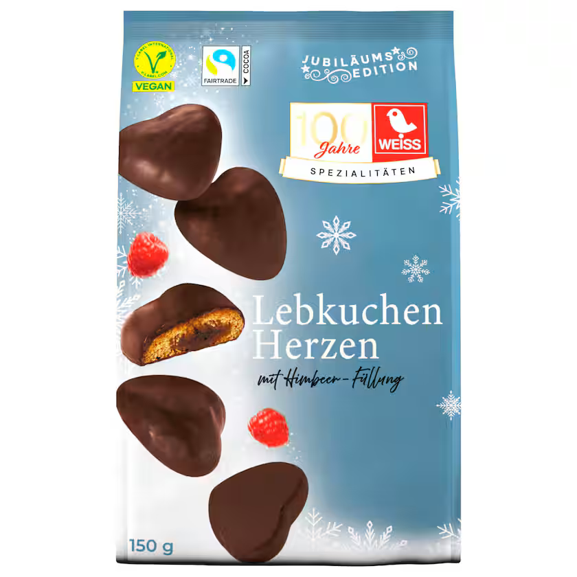 Weiss Filled Gingerbread Hearts Dark Chocolate Raspberry are a fruity and tangy interpretation of the classic Christmas treat. Tender, heart-shaped gingerbread cookies, filled with 28% raspberry fruit filling and coated with 21% fine dark chocolate ? a delight that tantalizes the senses and creates special moments during the Advent season.