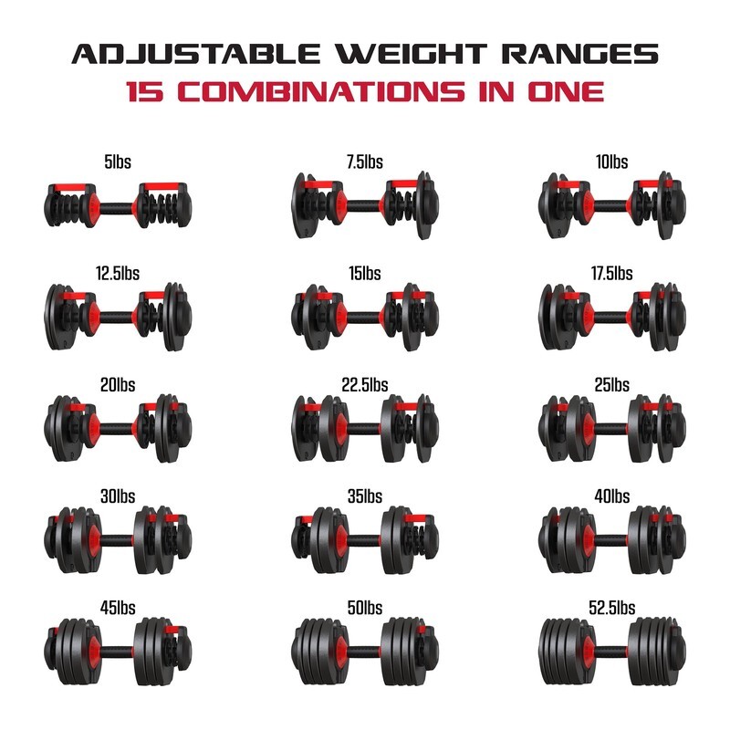 One-handed weight adjustment for convenient, simple functionality 10 plates with 15 different weight configurations: 5, 7.5, 10, 12.5, 15, 17.5, 20, 22.5, 25, 30, 35, 40, 45, 50, and 52.5 lbs. Anti-slip handle and safety lock to keep plates secure during your workout The perfect addition to any home gym Easy wipe-down maintenance Compact design with durable storage rack