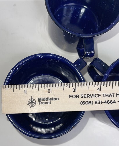 Cups have some wear. There are chips in the enamel in several places. (See photos where these chips are being pointed to.)