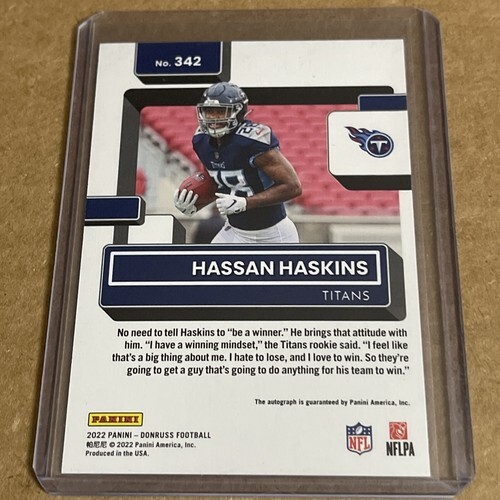 2022 Panini Donruss Rated Rookie Auto Hassan Haskins #342 Titans Autograph RC. Condition is Ungraded. Shipped with Standard Envelope for Eligible Items up to $20.