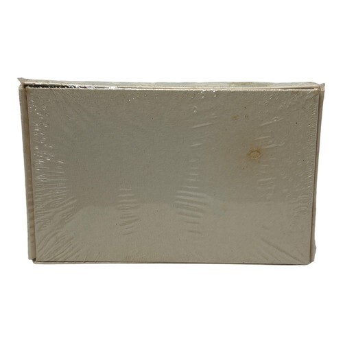 Box, under plastic wrap, has discoloration from age and storage.