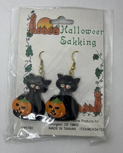 Vintage Drop Dangling Black Cat Jack O Lantern Pumpkin Earrings Halloween Theme