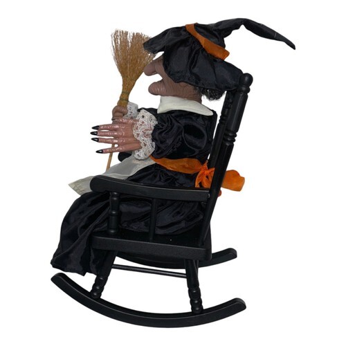 Witch DOES NOT MOVE on her own. She needs to be pushed to rock in her chair. Her arms do not move. Only her eyes light up and she cackles.