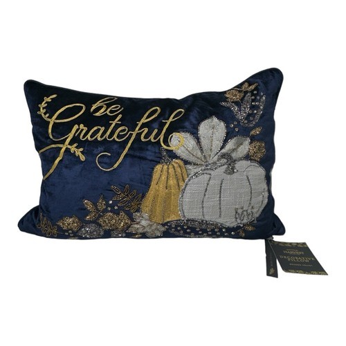 Envogue Harvest Throw Pillow Be GrateFul Pumpkin Embroidered Beaded Blue Autumn